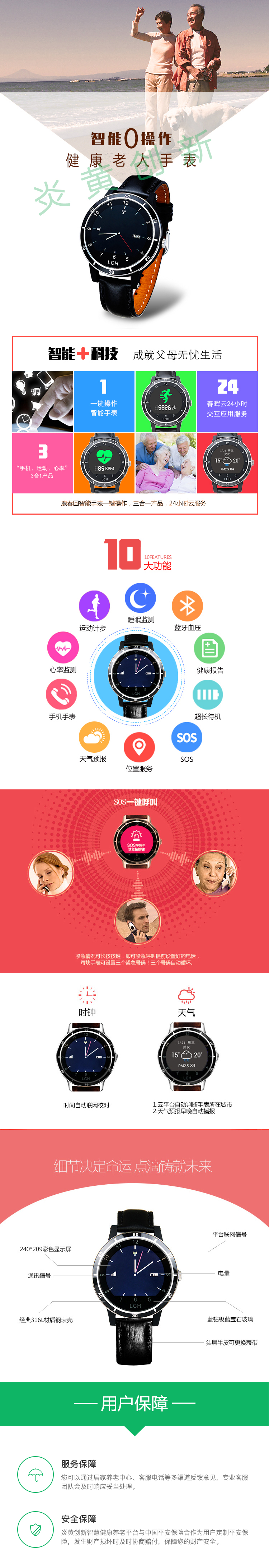 紧急求助、电话、血压、心率、运动、时间、天气、定位、电子围栏等功能。