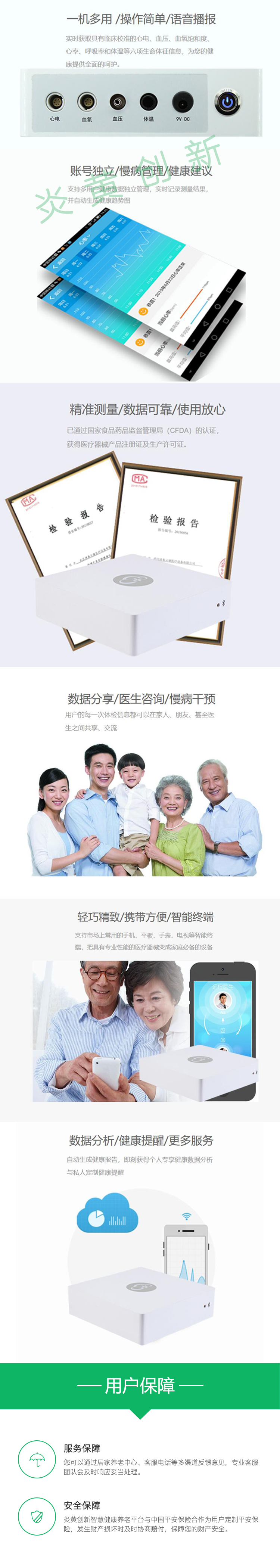 监测六项参数:七导心电,血压(高压、低压、平均压),血氧,心率,脉搏,体温。外加身高、体重、血糖测量