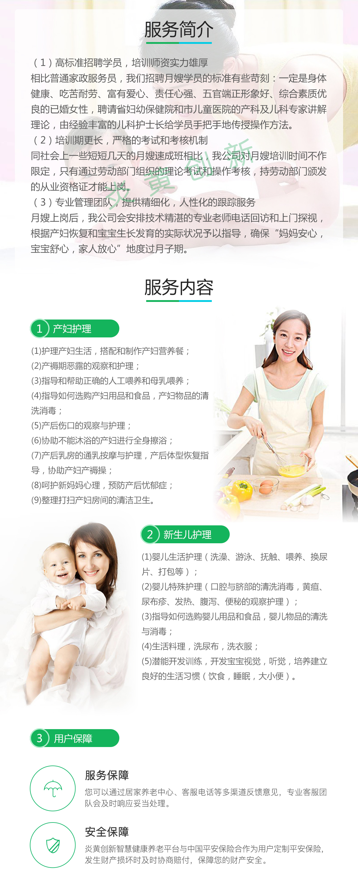 注: 1.连续26天,无休,月薪5000元-12000元/月,具体收费以到场服务人员为标准; 2.服务介绍费:具体收费以到场服务人员为标准; 3.产妇护理:提供母乳喂养指导、乳房护理及乳腺炎预防、乳头皲裂的预防及护理、产妇个人卫生指导、产妇形体恢复指导、产妇饮食搭配等; 4.婴儿护理:针对婴儿饮食、居室按排、日常护理和抚触进行指导,并提供语言和动作能力训练; 5.由家政服务公司为提供服务的家政人员购买“意外伤害保险”; 6.由家政服务公司为购买家政服务的雇主购买“雇主家庭财产责任保险”;