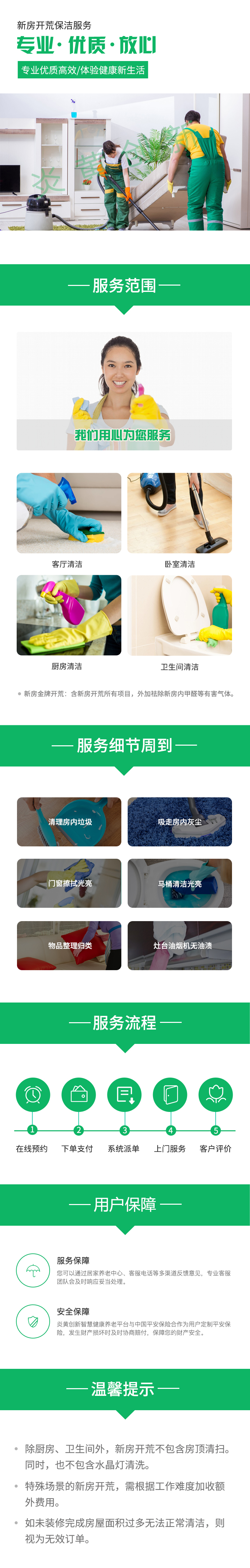 注: 1.开荒保洁以平米计费6~8元,具体收费以到场服务人员为标准; 2.服务介绍费:具体收费以到场服务人员为标准; 3.涂料、水泥点、玻璃胶等装修痕迹清除; 4.墙面、顶棚除尘、地面清洁、内窗玻璃、家具家电表面清洁、瓷砖、五金件等清洁。 5.由家政服务公司为提供服务的家政人员购买“意外伤害保险”; 6.由家政服务公司为购买家政服务的雇主购买“雇主家庭财产责任保险”;
