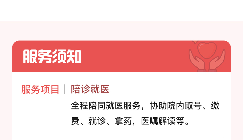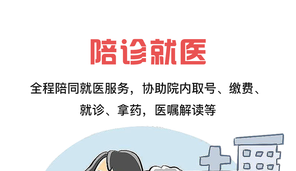 全程陪同就医服务,协助院内取号、缴费、就诊、拿药,医嘱解读等。