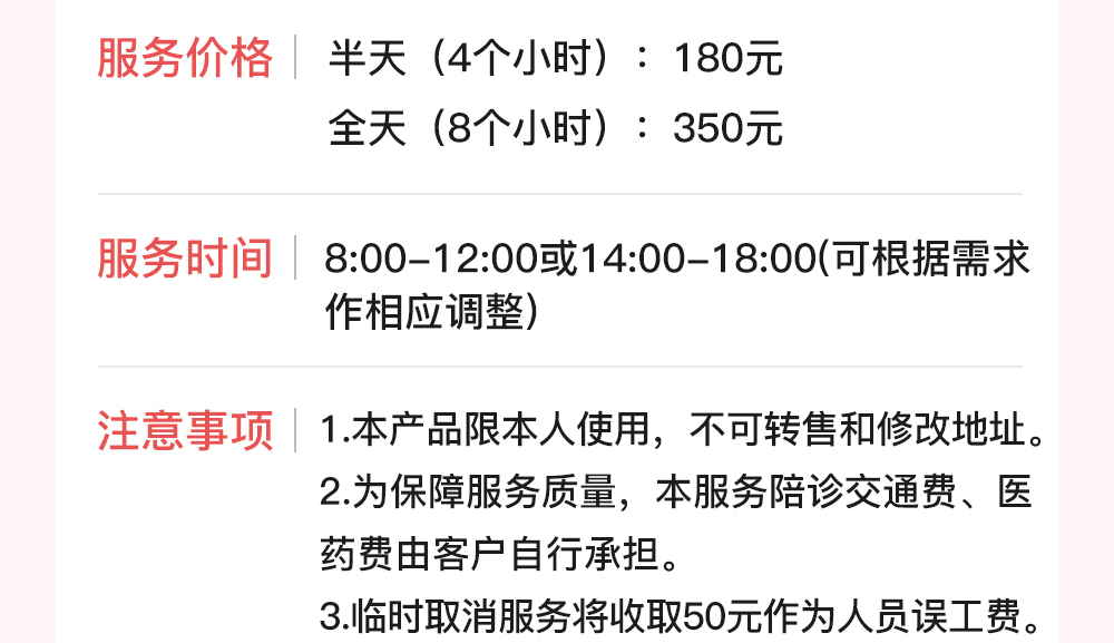 | 陪诊就医 | 180.0 | 元/次 | 2024-05-06 09:46:41 | 查看详情 |